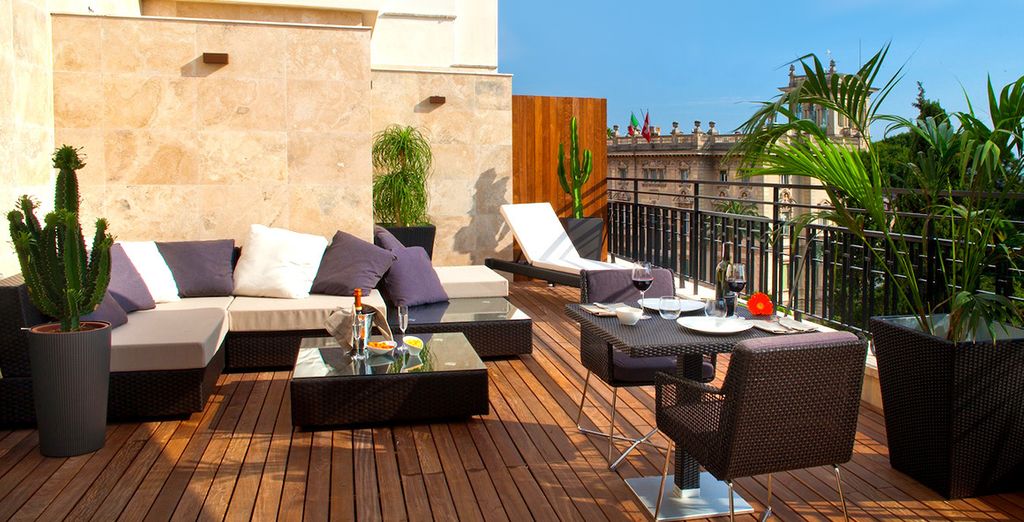 Ciò che amiamo: Design elegante e contemporaneo, terrazza panoramica con vista sui tetti romani, lounge bar esclusivo, posizione strategica vicino alla metro Spagna.