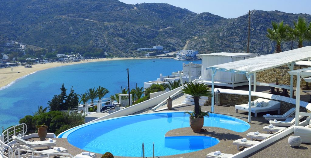 Ciò che amiamo: la posizione privilegiata a due passi da Mylopotas, le viste panoramiche sul mare, l'atmosfera luxury boutique perfetta per un soggiorno esclusivo.