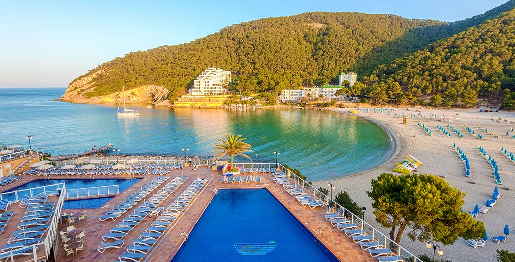 Situato direttamente sulla spiaggia di Cala Tarida, questo resort 5* è la scelta ideale per un weekend che combina mare e comfort. Con formula All Inclusive, piscine panoramiche e una spa completa, l'Insotel Tarida offre tutto il necessario per un soggiorno senza pensieri. La posizione privilegiata permette di godere di alcuni dei tramonti più spettacolari di Ibiza, mentre i servizi di qualità garantiscono relax e divertimento.