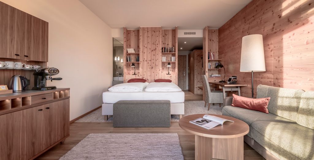 La camera Enjoy di circa 36 m² offre un elevato livello di comfort. Dopo una giornata intensa sulla neve, potete rilassarvi durante la vostra sessione di benessere personale nel bagno con vasca o concludere la giornata comodamente sul balcone esposto a sud. Al mattino, potrete iniziare la giornata in modo perfetto con un caffè caldo dalla macchina da caffè Illy, ammirando la magnifica vista.