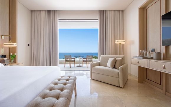 Sistematevi nella vostra camera Cap Deluxe. Moderna, elegante e decorata con colori tenui, questo spaziosa camera sarà il vostro rifugio di tranquillità durante il vostro soggiorno. Trascorrete una notte tranquilla sul vostro comodo letto king size e fate una pausa nel vostro bellissimo bagno con vasca. La sera, lasciatevi cullare dal suono delle onde dal vostro ampio balcone privato e ammirate la vista panoramica sul mare.