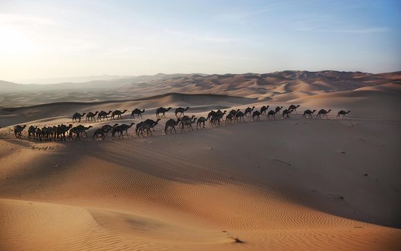 Iniziate la giornata con una passeggiata guidata nella natura all'alba, dove la bellezza della riserva si risveglia intorno a voi. Al tramonto, immergetevi in un'esclusiva lezione di cammello emiratino, per entrare in contatto con queste maestose creature in un tranquillo ambiente desertico. Godetevi un po' di relax durante la giornata prima di sistemarvi per una notte tranquilla ad Al Maha, a Luxury Collection Desert Resort & Spa, Dubai 5*, dove la magia del deserto si dispiega sotto le stelle.