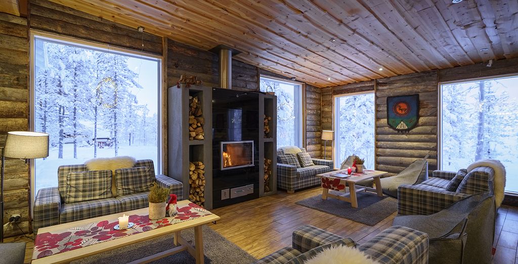 - Il pernottamento in cottage con volta di vetro e sauna privata in piena natura dai quali potere assistere all’Aurora Boreale, comodamente sdraiati sul vostro letto