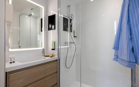 Godetevi un'accogliente area lounge, ideale per assaporare un momento di relax o per pianificare le vostre avventure in città. Rilassatevi nella spaziosa cabina doccia, una vera oasi di benessere. E quando cala la notte, lasciatevi avvolgere dal comfort di un letto morbido, che favorisce un buon sonno.