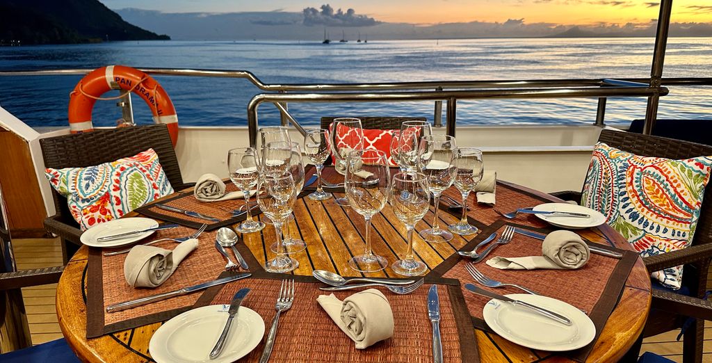 Appena saliti a bordo, immergietevi in un mondo di atmosfera e ospitalità con un caloroso benvenuto, una bevanda rinfrescante e una deliziosa cena di benvenuto che stabilisce il tono perfetto per il viaggio che vi attende. Mentre il crepuscolo cala, diremo addio a Papeete e salperemo verso l'incantevole isola di Moorea.