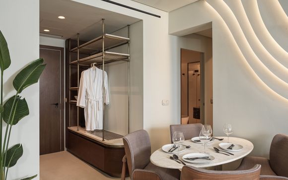 Scegliete questa elegante suite Deluxe con letto king size e un confortevole salotto e sala da pranzo con angolo cottura. Ammirate la magnifica vista sul mare mentre vi rilassate sul balcone e apprezzate l'arredamento contemporaneo del bagno.