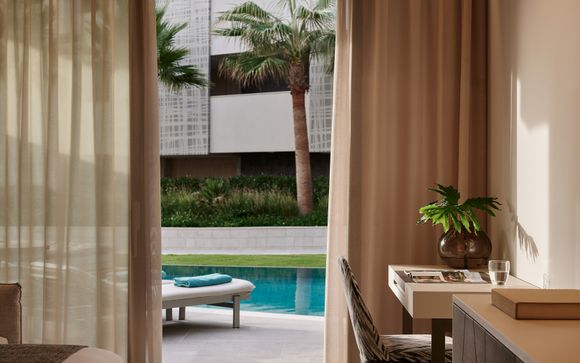 Accomodatevi nella camera Superior vista mare con piscina condivisa, un ambiente luminoso dall'arredamento contemporaneo ed elegante. Avrete accesso diretto alla piscina in comune e a una vasta terrazza arredata con sedie a sdraio in legno, ideale per ammirare le acque cristalline del Mar Egeo.