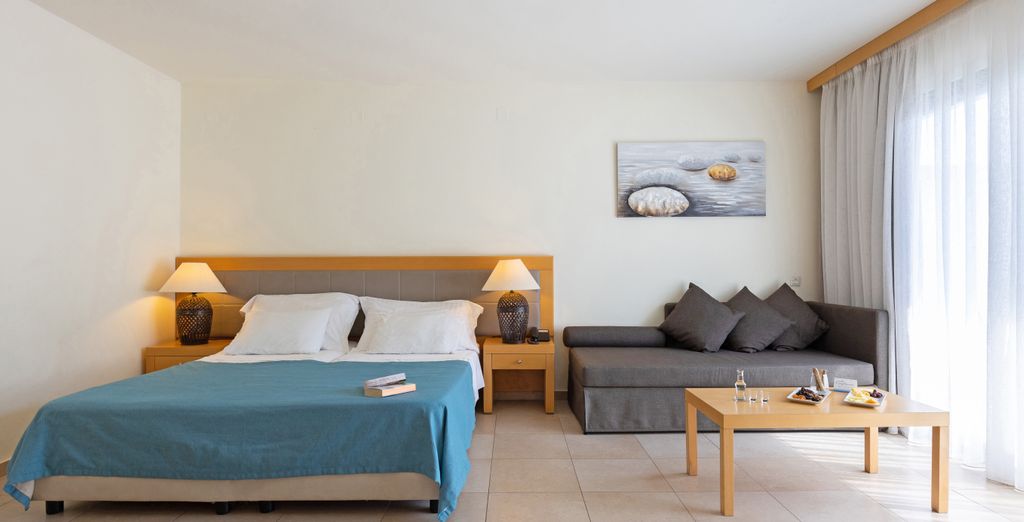 Per un comfort maggiore e un tocco di lusso in più scegliete l'elegante Junior Suite vista mare laterale, composta da una camera con due letti singoli, divano e bagno con vasca o doccia.