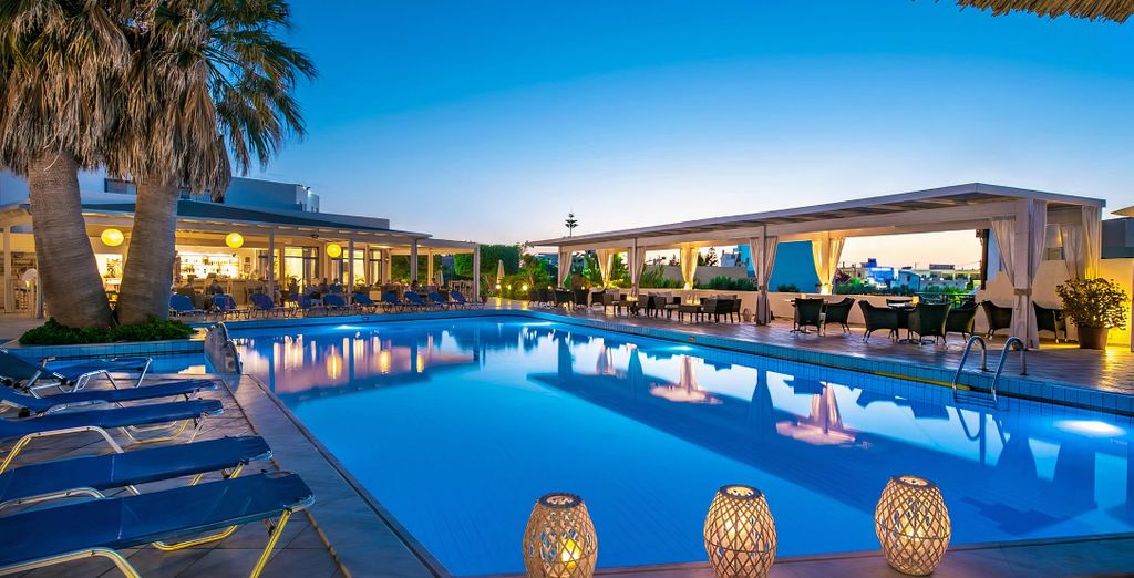 Trascorrete la giornata perfezionando l'abbronzatura e sorseggiando un cocktail esotico o fate un tuffo nella grande piscina all'aperto dell'hotel. Passeggiate negli ampi giardini mediterranei, sorseggiate un caffè e incontrate gli amici nella hall dell'hotel. Potrete raggiungere la spiaggia, distante soli 150 metri, e fare un tuffo nelle splendide acque blu del Mediterraneo.