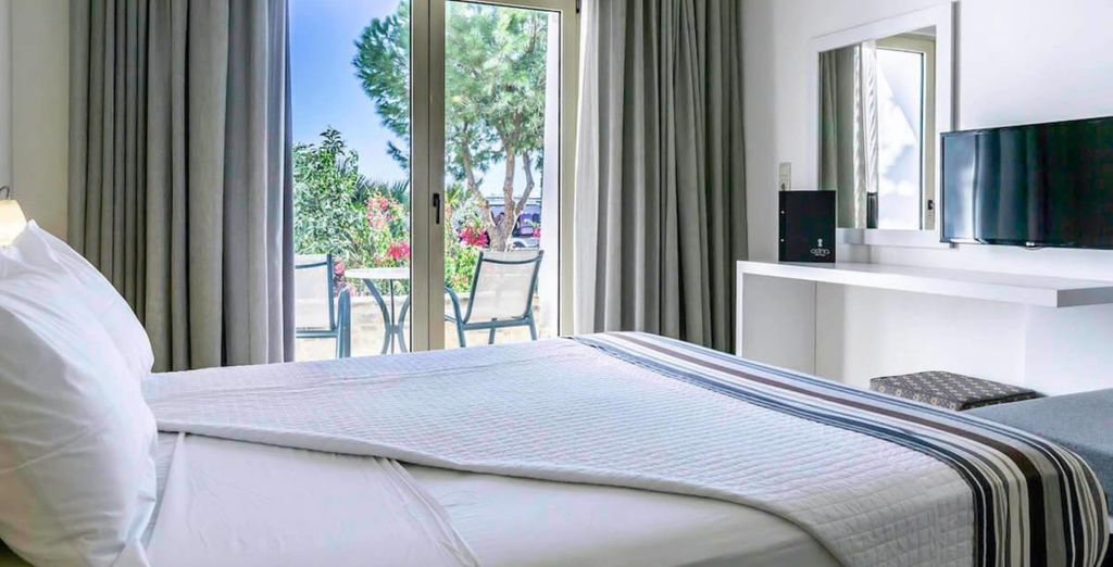 Scoprite una camera Comfort moderna, arredata con cura e decorata con semplicità ed eleganza. Ideale per un soggiorno romantico o per una giovane coppia con un bambino, qui passerete notti riposanti e dolci mattine assolate, grazie alla vostra vista sul giardino o sul mare, a seconda dell'offerta scelta.