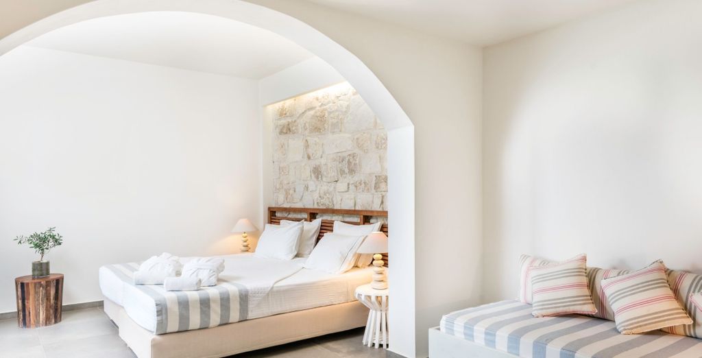 Abbandonatevi al lusso della Suite con piscina privata. Lo stile architettonico tradizionale si fonde elegantemente con l'arredamento moderno, creando una deliziosa atmosfera calda e intima. Composta da una splendida camera da letto, soggiorno, angolo cottura e bagno, la vostra suite sarà la base perfetta per una fuga cretese. Non vi resta che posare i vostri bagagli e godervi la vostra piscina privata all'aperto, per dei momenti speciali.
