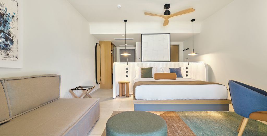 Questa lussuosa Junior Suite Swim Up con accesso diretto alla piscina comune offre tutti i comfort per un soggiorno rilassante.