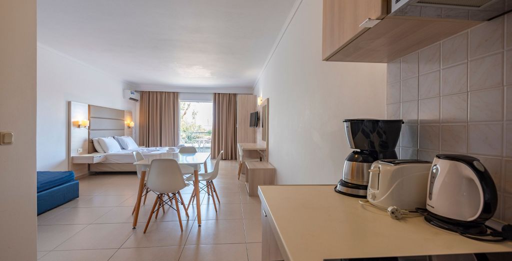 Ogni appartamento dispone di una cucina che vi consentirà di cucinare a puntino durante la vostra vacanza in Grecia. In alternativa, recatevi nella cosmopolita Kos Town per trovare una serie di ristoranti e bar, tra cui le tradizionali taverne greche. A bordo piscina troverete uno snack bar con opzioni a buffet e à la carte per colazione, pranzo e cena.