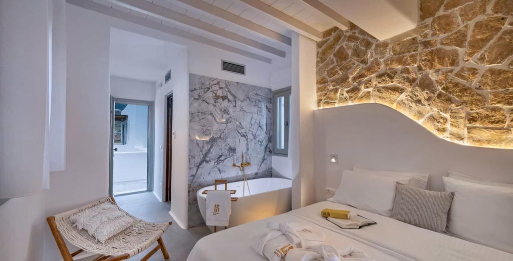 Il massimo del lusso vi attende in questa Suite Executive con Jacuzzi privata e 2 balconi. Dedicata agli ospiti che desiderano vivere l'esperienza del massimo comfort a Mykonos.