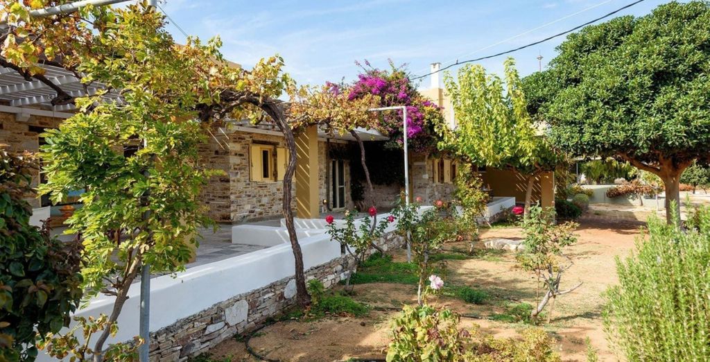 L'ambiente tranquillo è completato da un vigneto privato e da diverse terrazze spaziose che si trovano all'ombra di alberi lussureggianti e frondosi. La dolce fragranza degli arbusti in fiore è trasportata dalla brezza dell'isola in questo paradiso nascosto, perfettamente situato a soli 2 km da Naoussa, un caratteristico villaggio di pescatori.