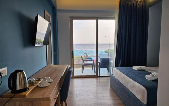 La terrazza dell'elegante Camera Deluxe vista mare si affaccia su un magnifico panorama, offrendovi alla vista Toroneos e l'Egeo, dove il mare incontra il Monte Olimpo.