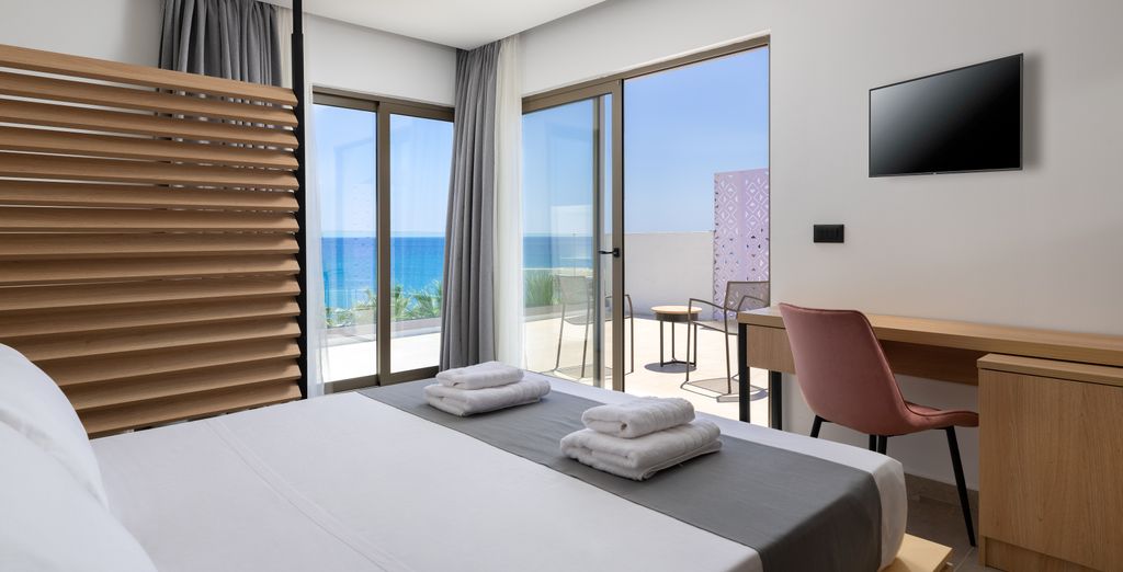 La camera Premium Deluxe vista mare si distingue per la sua eleganza. Ammirate il panorama e preparatevi a un soggiorno indimenticabile!
