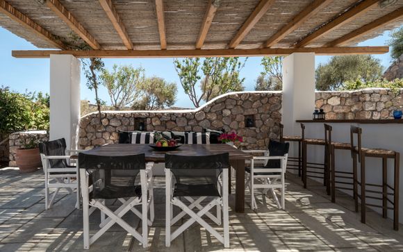 Potrete godere di spazi esterni completamente arredati, con possibilità di rilassarsi al sole o all'ombra, nonché di un'ampia sala da pranzo e di un barbecue per cenare all'aperto sotto il cielo greco.