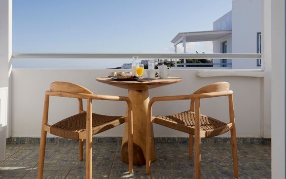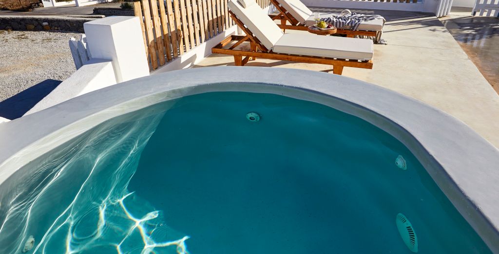 Concedetevi una pausa di assoluto relax in questa elegante Suite dal design cicladico perfettamente in armonia con le moderne dotazioni. Godetevi la Jacuzzi esterna riscaldata, dove vi sembrerà che il tempo si sia fermato.
