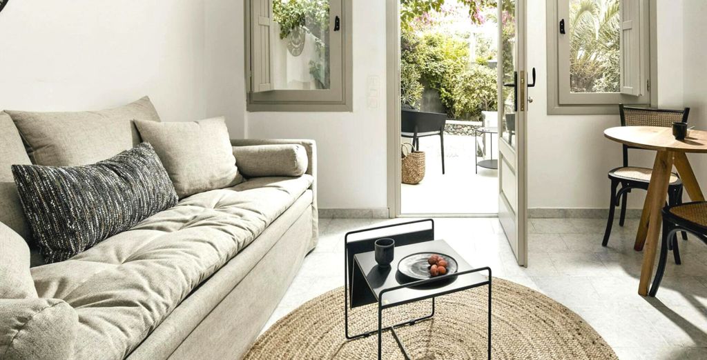 Ispirato all'architettura tradizionale di Santorini, l'Appartamento Split Level vi accoglie per un soggiorno autentico ma senza compromessi di eleganza. I soffitti a volta, i toni rilassanti e gli arredi fatti a mano creano un'atmosfera irresistibile. Al piano terra si trova un ampio soggiorno con vista sul giardino o sulla piscina. Al piano superiore, troverete un'accogliente camera da letto che vi garantirà un piacevole riposo notturno.