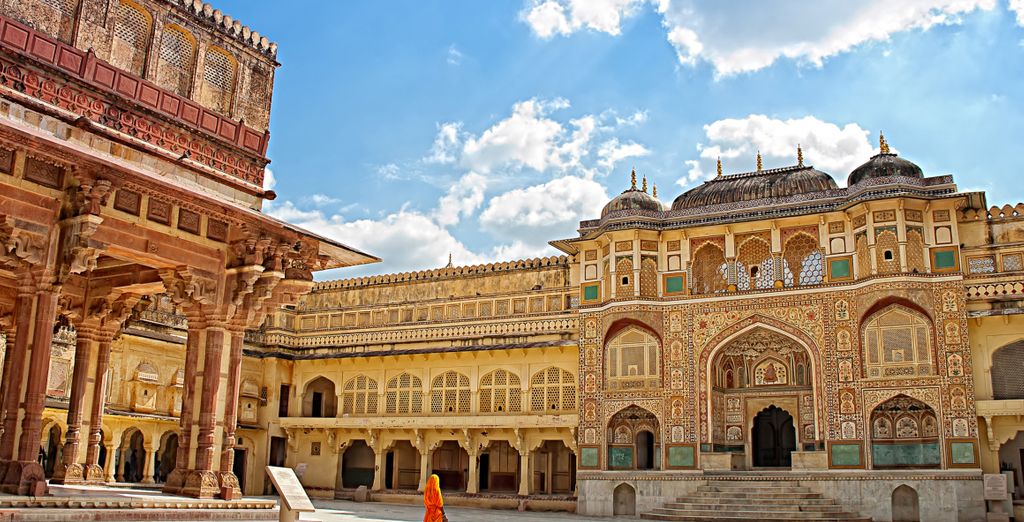 Un elefante (o una jeep in caso di impedimenti) vi condurrà sulla cima della cittadella fortificata affacciata sul lago di Moat e circondata da bastioni. Una volta in alto, lo spettacolo mozzafiato del complesso di sale e cortili: all’interno del forte si dispiegano sale, specchi, colonne, pietre preziose, dettagli in argenti, miniature e affreschi, a testimonianza delle immense ricchezze dei maharaja. Di enorme fascino il Sheesh Mahal, o sala degli specchi, dove ad illuminarla basta una sola piccola torcia che moltiplica la propria luce riflessa, appunto, nei tanti specchi che la rivestono.