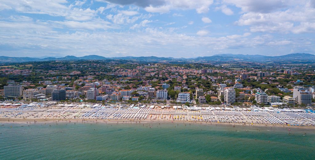 • Soggiornare in un moderno hotel nella rinomata località di Cattolica e stendere il vostro asciugamano sulla spiaggia privata lunga tremila metri