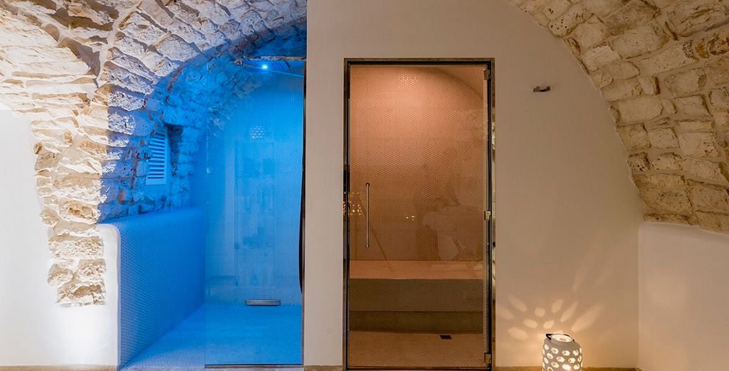 La spa è l'angolo dedicato al benessere. Un percorso intimo pensato su misura per due persone. Salette in pietra e stanze con volte a botte accolgono la confortevole idropiscina, la sauna, il bagno turco e la doccia emozionale. Le tisane Hammam e i massaggi completano il vostro momento di relax.