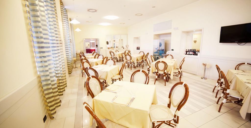 Il servizio ristorante è accessibile sia a pranzo che a cena. La sera potrete scegliere tra la terrazza sul mare o la griglieria: la struttura si impegna, in ogni caso, a soddisfare le vostre richieste. L'hotel offre un servizio bar, usufruibile all'interno, all'esterno, nell'area solarium, con servizio in camera e sulle terrazze comunicanti con le stesse. Il servizio comprende prodotti di caffetteria, bibite analcoliche, vini, liquori e cocktail.