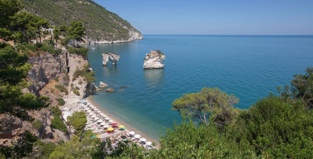 In una delle più suggestive baie del Parco Nazionale del Gargano, a soli 12 km da Mattinata e nel cuore del Parco Biogenetico "Monte Barone", sorge l'Apulia Hotel Baia Dei Faraglioni 4*. L'incantevole spiaggia di ciottoli, riservata esclusivamente agli ospiti dell'hotel, è raggiungibile tramite un ascensore scavato nella scogliera, che vi condurrà direttamente ai maestosi Faraglioni: una cornice perfetta per una vacanza indimenticabile.