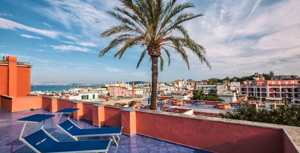 Sul tetto dell'hotel potrete rilassarvi sotto il caldo sole ischitano, ammirando un panorama mozzafiato e approfittando dei comodi lettini del solarium.