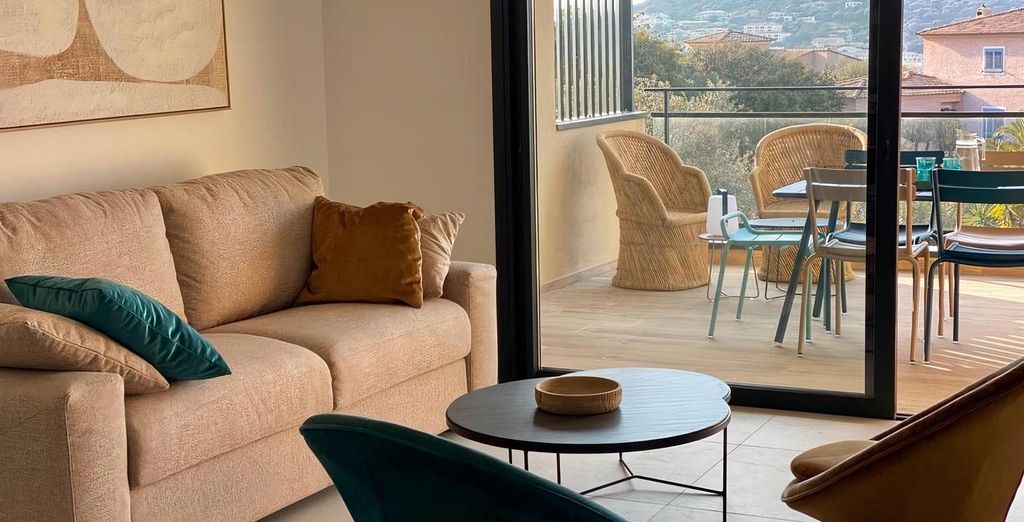 Accomodatevi nell'incantevole Bilocale Comfort, con i suoi arredi contemporanei, gli sprazzi di colore e la spaziosa terrazza di 20-22 m2. Preparate pasti deliziosi con prodotti locali acquistati al mercato, grazie alla vostra cucina completamente attrezzata.