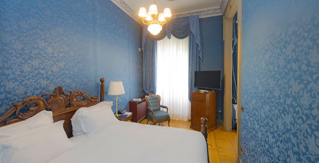 - Camera Deluxe (26 m² / max 2 persone): affacciata sui giardini dell'hotel, vanta interni eleganti in colori caldi.