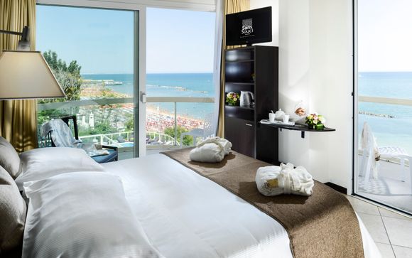 Inserito nella splendida cornice di Gabicce Mare, l'hotel Sans Souci 4* vi accoglie nei suoi ambienti moderni, ampi e luminosi, grazie alla presenza di vetrate e ampie finestre che regalano un meraviglioso gioco di luci creato dall'incontro tra l'azzurro del cielo, il riflesso del mare e il verde che circonda la struttura.
