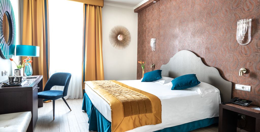 Il comfort è garantito nella camera Premium: scegliete questo spazio elegante se desiderate godere di un ambiente tranquillo e ben attrezzato durante la vostra vacanza a Roma.