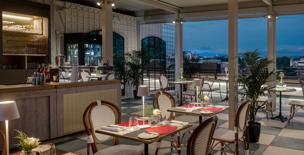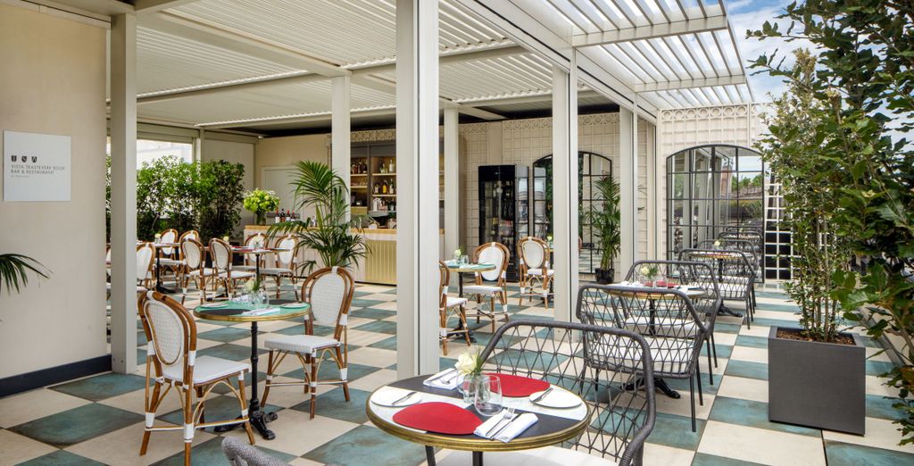 UNAHOTELS Trastevere Roma soddisferà le vostre esigenze grazie alla ricca proposta culinaria tradizionale e internazionale. Il Vista Trastevere Roof Bar & Restaurant dal design raffinato e accogliente, si trova nella corte interna ed è perfetto per un piacevole coffee break o per un rilassante aperitivo in un angolo molto silenzioso.