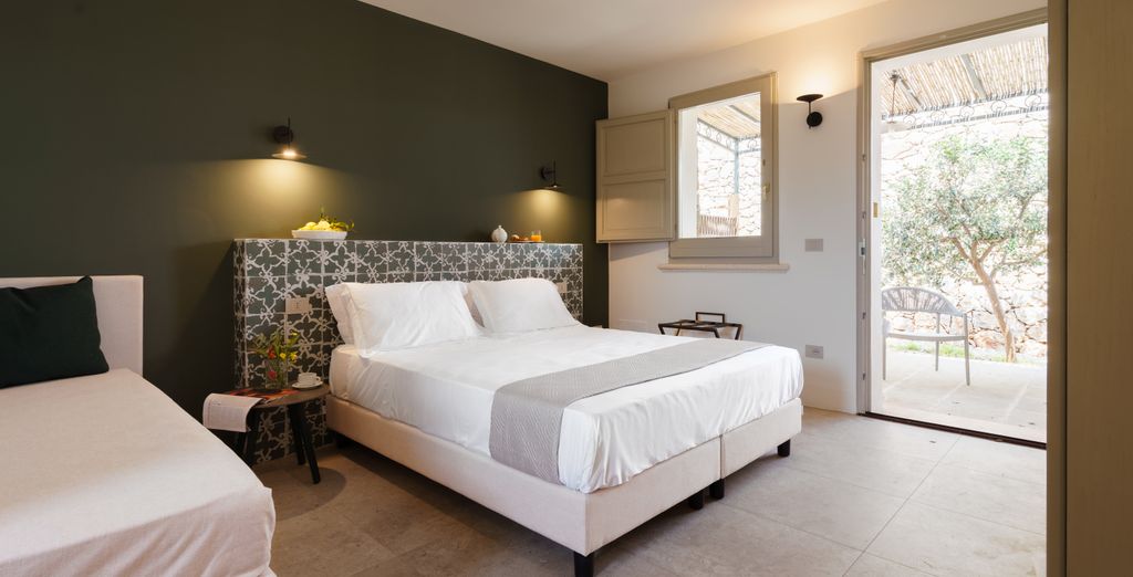 La vostra camera Superior Doppia vi accoglie in uno spazio caldo e confortevole che vi farà vivere una vera immersione nella natura del Salento!