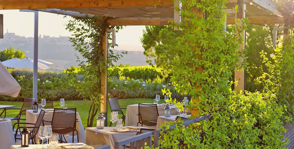Le sale da pranzo del Ristorante, come nelle residenze di campagna di una volta, sono differenti tra loro per dimensioni, colori dominanti, arredi: due sale principali, denominate sala rossa e sala avorio, e due salette più piccole, la saletta verde e quella del camino. Ciascuna sala offre un ambiente particolarmente accogliente, che è possibile riservare per un pranzo o una cena più intima. Nella stagione estiva il servizio è effettuato sulla terrazza panoramica con vista su Todi.