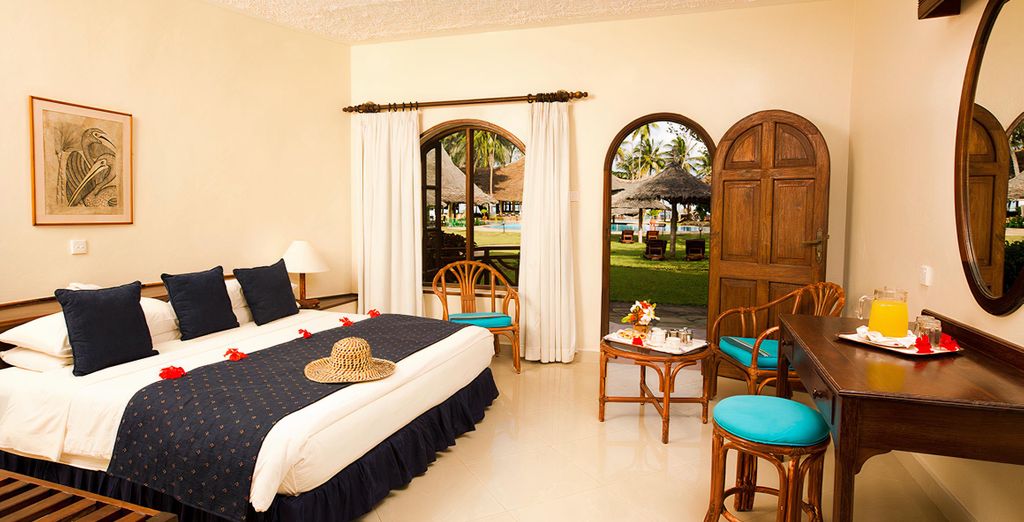 Queste confortevoli camere presentano tutti i servizi e i vantaggi di una camera Standard con l'aggiunta di una vista sul mare turchese di Diani.