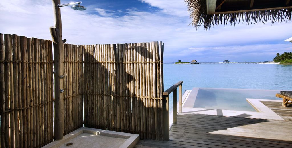 Le ville del COMO Maalifushi sono tranquilli rifugi, con esterni caratteristici dei pini della Nuova Zelanda e tetti di paglia Kajan.