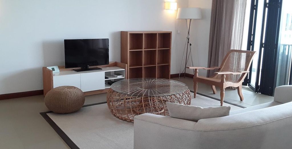 Questo appartamento Premium con 2 camere da letto offre uno spazio abitativo bello e luminoso, aperto su una cucina completamente attrezzata. Le sue decorazioni e i suoi arredi confortevoli lo rendono un ambiente ideale per fare il pieno di energia. Da una delle due ampie terrazze, ammirate la vista mozzafiato sui verdi giardini del villaggio e sulla magnifica laguna turchese in lontananza.