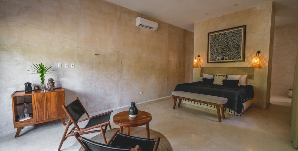 Progettata per offrire comfort e relax, la Suite con terrazzo è composta da un'incantevole camera da letto con letto king-size, spogliatoio e bagno con doccia. Dispone di un patio o di una terrazza, perfettamente integrati nell'ambiente circostante. Situata in posizione ideale a pochi passi dalla piscina Mestizo, invita a vivere un'esperienza che unisce serenità ed eleganza.
