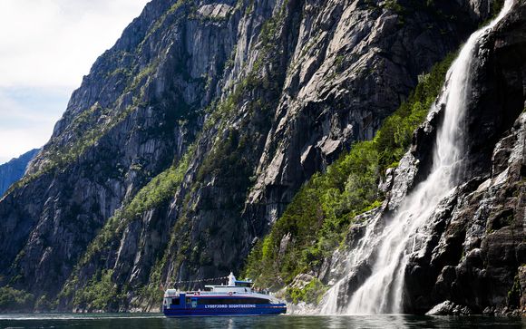 Salirete a bordo di un moderno battello elettrico che naviga tutto l'anno tra il centro di Stavanger, il Lysefjord e Preikestolen.