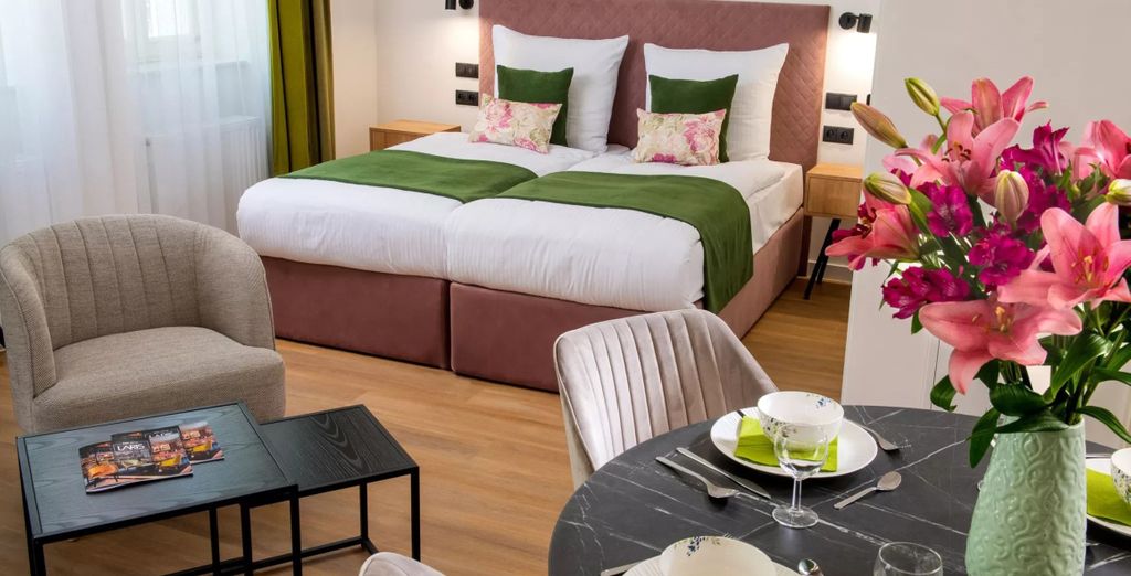 L'Appartamento Premium, con la sua area salotto, la sua camera e il suo angolo cottura, vi offre una comoda pausa dalla città nella completa privacy.