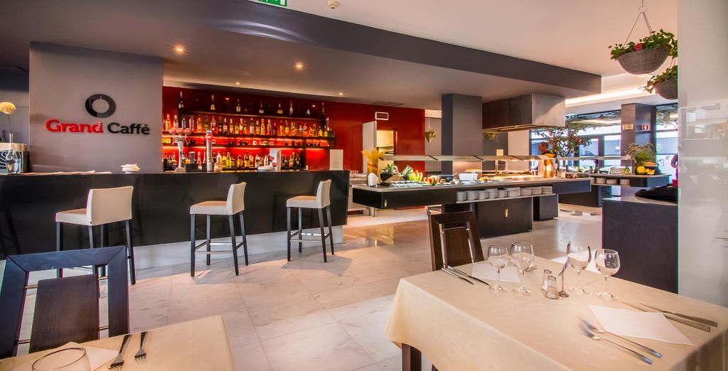 La terrazza a bordo piscina, arredata in modo semplice ed elegante, è lo spazio ideale per consumare spuntini leggeri, mentre la sera viene servito un buffet al Grand Caffé Bar. Godetevi momenti di relax con appetitosi cocktail o provate i bar e i ristoranti locali.