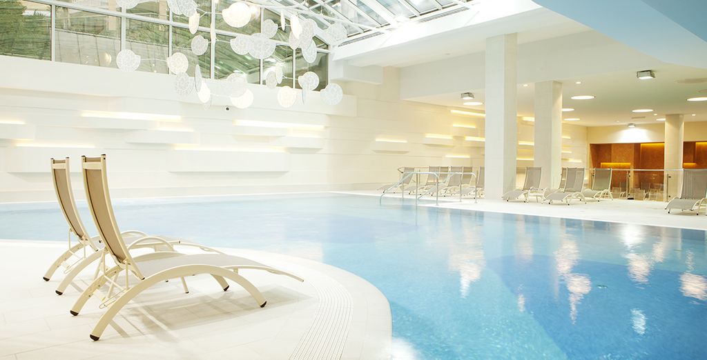 Scoprite la piscina panoramica interna e quella esterna, le 4 piscine con idromassaggio interne e le 3 piscine con idromassaggio esterne con sedute e lettini.