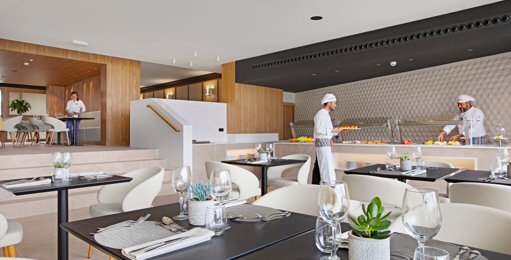 Per la colazione, il pranzo e la cena, potrete gustare un delizioso e vario buffet presso il ristorante Adagio. Per un'esperienza ancora più unica, recatevi al Mirablau Beach Bar & Restaurant, dove potrete deliziare il vostro palato con una vista sul mare. Avete voglia di un drink durante il giorno? Assecondatela al Palmira Pool Bar o al Bluemoon Lounge Bar.