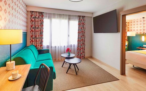 Che ne dite di sistemarvi in una Suite confortevole e colorata? Dotata di zona notte separata, ampio soggiorno-sala da pranzo ed elegante bagno, questa Suite è perfetta per un piacevole soggiorno sotto il sole di Siviglia.