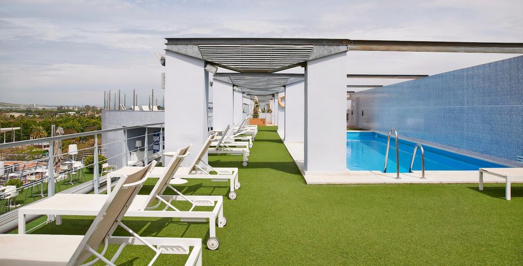 Al mattino, tenetevi in forma nella palestra al quinto piano. In seguito, rinfrescatevi sotto il sole spagnolo nella piscina all'aperto sul tetto e rilassatevi su un lettino, prima di esplorare Siviglia.