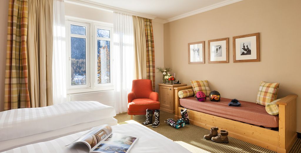 La vostra camera Superior offre servizi di qualità e una splendida vista su Pontresina. Ne apprezzerete le dimensioni, l'eleganza e la luminosità.