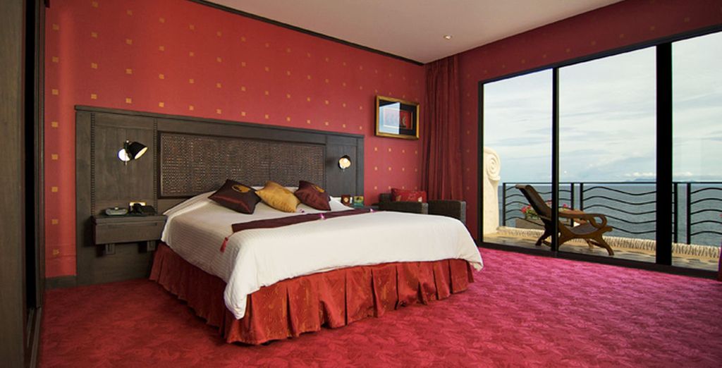 Le spaziose camere del resort offrono un'incredibile vista panoramica sull'oceano e sono tutte dotate di Wi-Fi e di articoli da bagno di lusso.